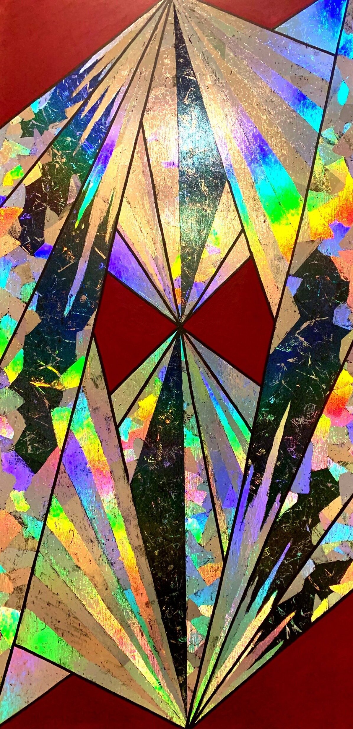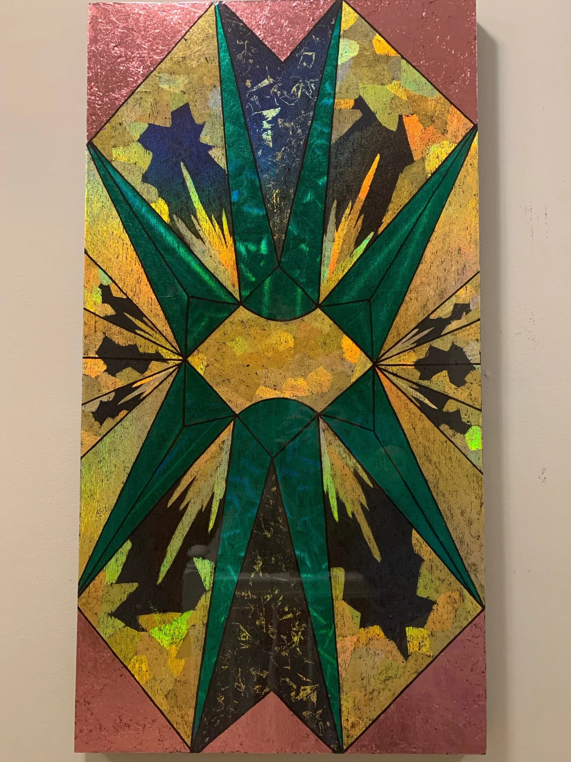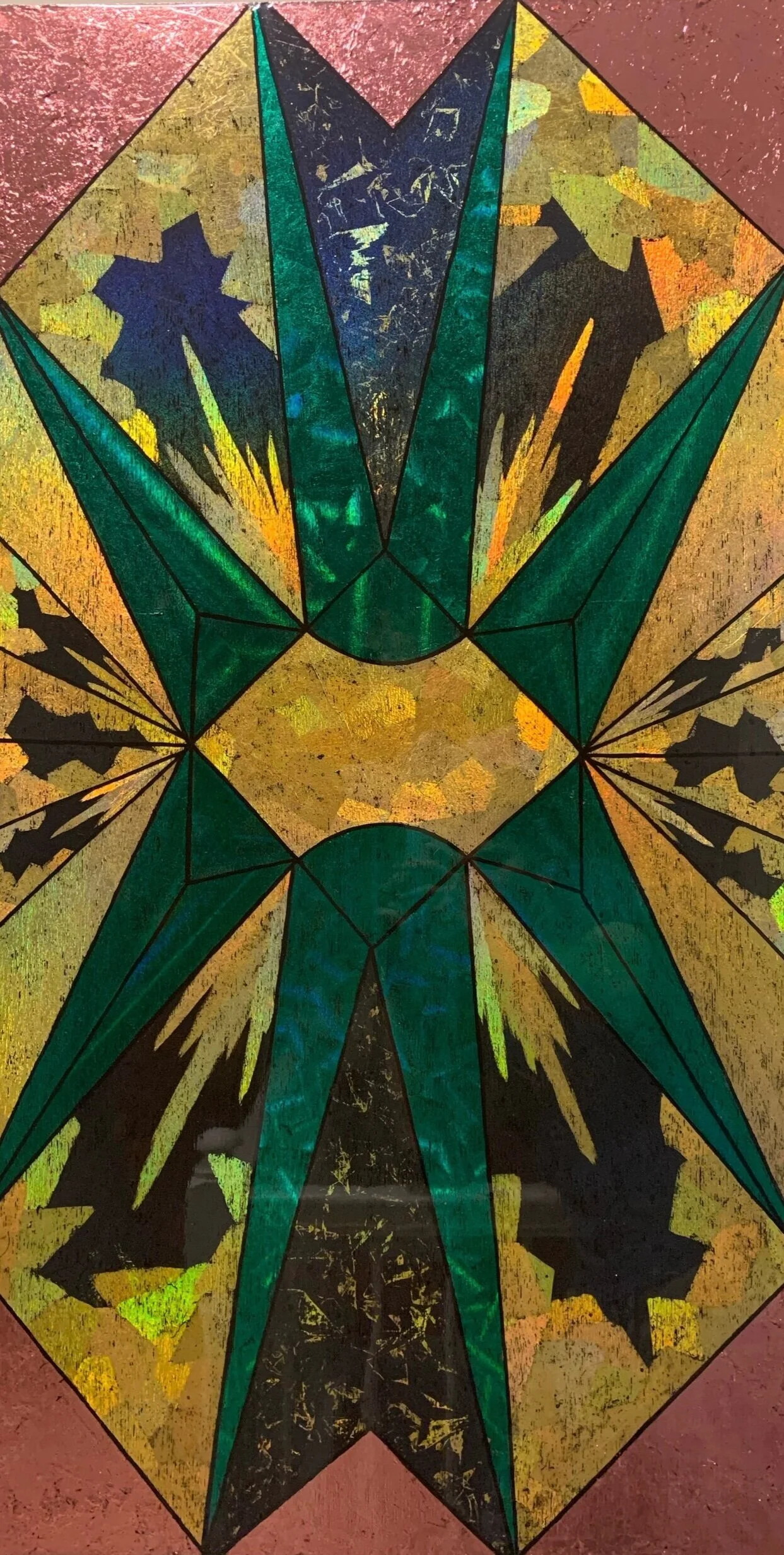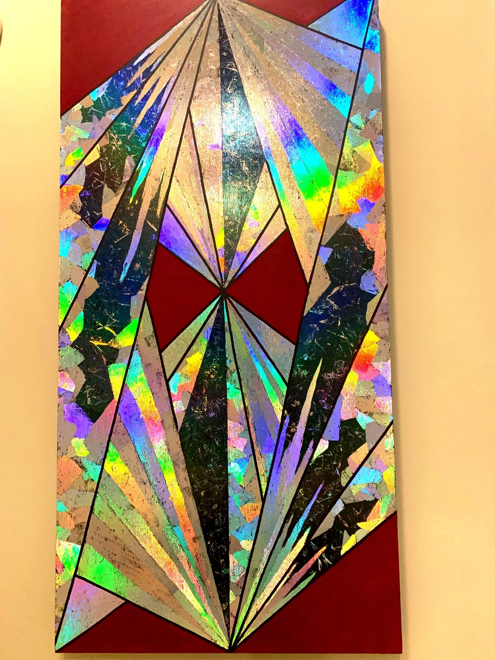 Once the initial design has taken shape and my vision is clear, I move on to constructing with wood sheets or masonite from scratch. most pieces start with a deep base or red, in the past few years i have played around with bright bases to add new prospective. This solid backdrop serves as a stage on which the vibrant holographic colors will truly shine.